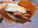 揚げたての薄い豚肉がほのかに甘いパンに包まれ〜